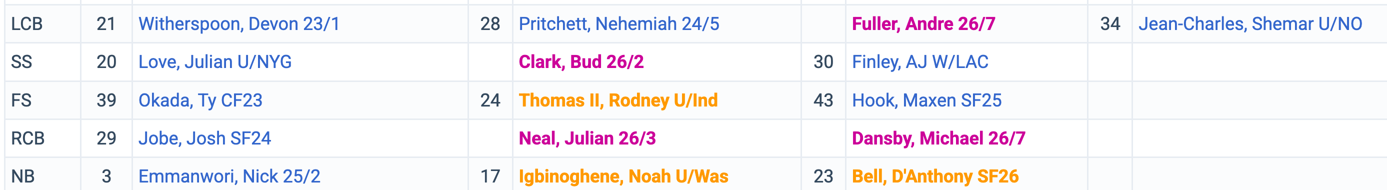 Then on day two of the draft, Schneider picked safety Bud Clark and cornerback Julian Neal. On day three, two more defensive backs in corners Andre Fuller and Michael Dansby.