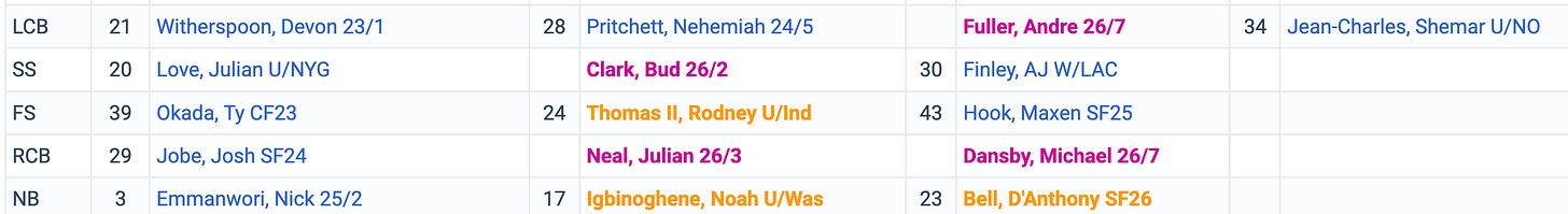 It’s not that starters could be easily replaced, but the schematic/coaching advantage that Macdonald has brought to the Ravens and Seahawks means that in the secondary VALUE is better than STAR POWER.