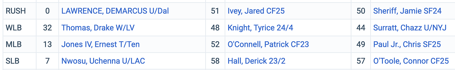 The edge and linebacker positions look great for Seattle going into 2026—this is all but the same defense that won the Super Bowl minus Boye Mafe—but looking one year ahead the Seahawks don’t have a clear succession plan for DeMarcus Lawrence, Uchenna Nwosu, or Hall (a pending free agent).