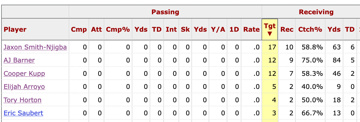 Cooper Kupp had as many red zone targets as A.J. Barner this season, which highlights how Seattle was running out of options as the season wore on: Elijah Arroyo had 5 red zone targets prior to his injury. Tory Horton caught two red zone touchdowns (as many as Kupp) on only four targets.