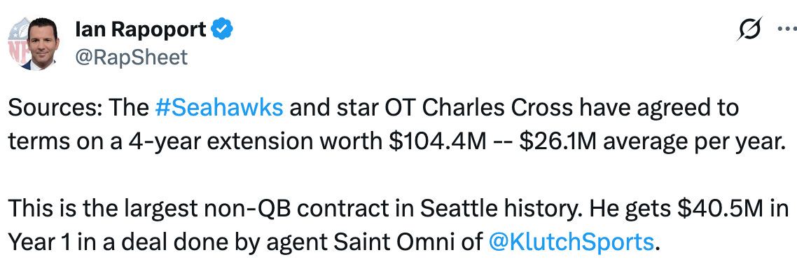 On Sunday, the Seahawks decided that they do know the value of Cross to the team: 4 years, $104.4 million.