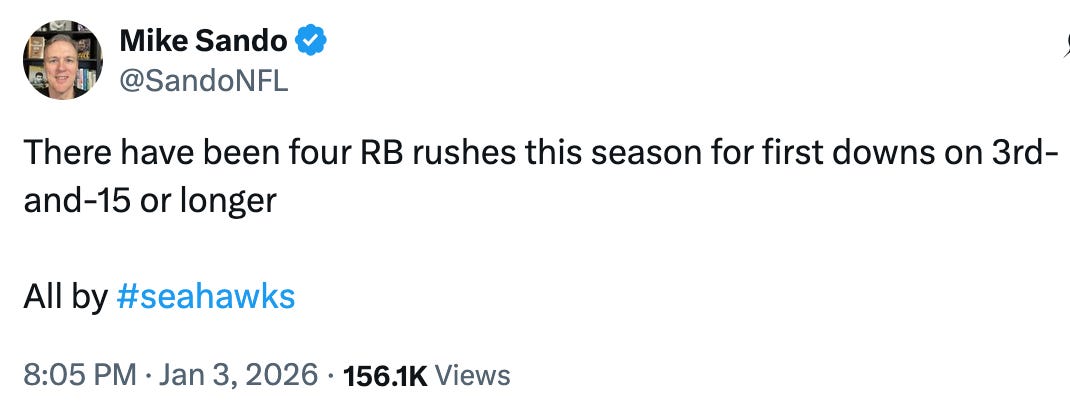 Sea Hawk Run! Hey, NFL. The Seahawks defense now gets two weeks of rest and home field. And the running game just got into rhythm. Playoff football.