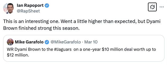 Josh Palmer, Tutu Atwell, and Dyami Brown all signed contracts worth $10 million per season, although Palmer is the only one who got multiple years. Still, the Rams banked $10 million on Atwell for one season despite him cracking 500 yards for the first time in 2025 (with no touchdowns), while the Jaguars are paying the same amount for Brown even though he had a career-high 308 yards in 2024.