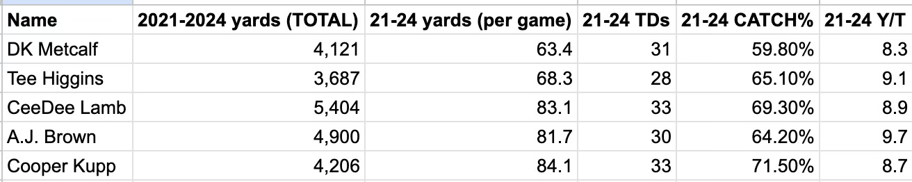 2024 Yards per game: Kupp 59.2, Metcalf 66.1