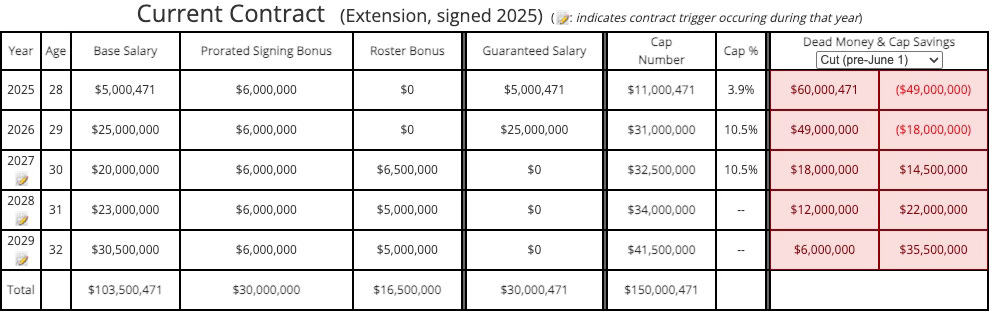 Even if the Steelers cut Metcalf in 2028, which seems more likely than not given the $22 million cap savings that would come with that move, Pittsburgh is still on the hook for $12 million in dead money that season and $6 million in 2029.