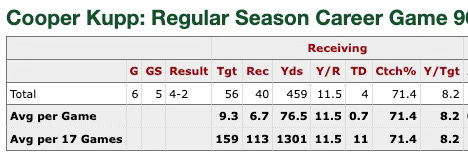 Over Kupp’s last eight regular season games, even including a slump, he had 33 catches for 408 yards and 4 touchdowns.