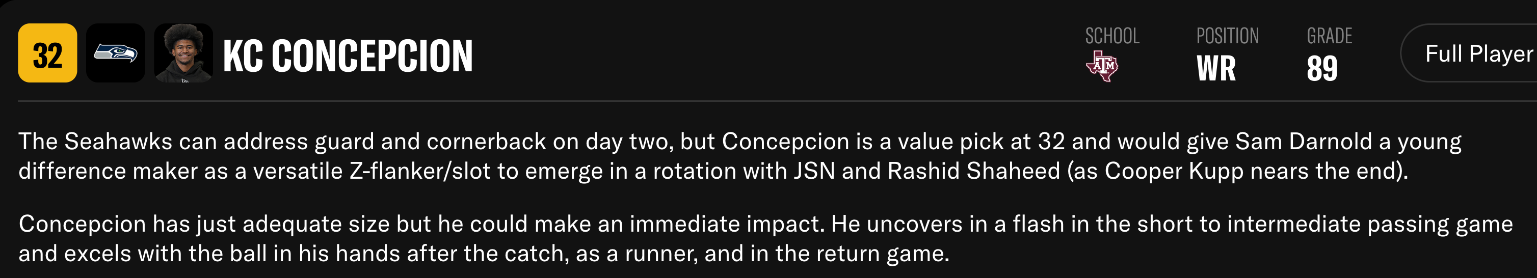 But the obstacle between the Seahawks and a receiver pick is not whether or not Seattle could land a quality prospect at the position at 32. It’s “When and where do you play KC Concepcion if you’re Brian Fleury?”
