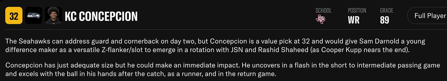 This is an industry that follows the leader so I would not be surprised if much more steam builds towards Seattle picking a receiver. And if you listen to some people, like Josh Norris at Underdog Fantasy, you could be easily convinced that Concepcion is the most underrated first round prospect.