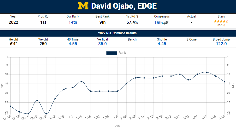 I routinely read 2022 NFL Mock drafts in 2021 and rarely did Michigan edge rusher David Ojabo reach an early first round projection. As you can see at NFL Mock Draft Database, Ojabo was usually a late-first, second round prospect and it wasn’t until mid-January of this year that his average mock draft position hit mid-first round: