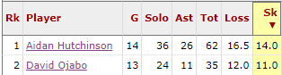 Ojabo declared for the draft on January 4th and then his stock blew up as all the Hutchinson-watchers realized that Michigan would be sending not one, but two players with 11+ sacks to the NFL in one year. Hutchinson helped Ojabo. How much did Ojabo help Hutchinson though?