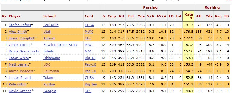 I was also being generous with my ratings on a couple of those 4s and 2s. Is it really that surprising that Rodgers fell out of the top-10 when you consider that these were the reports about him pre-draft? And Tedford had plenty to do with it.