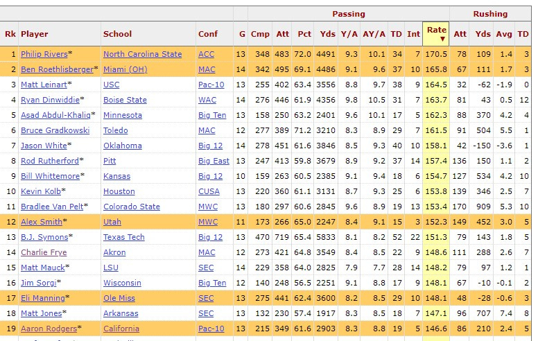 Which begs the question of whether Tedford's latest prize pupil, California quarterback Aaron Rodgers, the likely choice of the San Francisco 49ers with the top overall pick in the 2005 NFL draft, will be more productive than the five that preceded him into the league. That quintet Trent Dilfer (Tampa Bay, 1994), Akili Smith (Cincinnati, 1999), David Carr (Houston, 2002), Joey Harrington (Detroit, 2002) and Kyle Boller (Baltimore, 2003) has pretty much flopped both aggregately and individually.