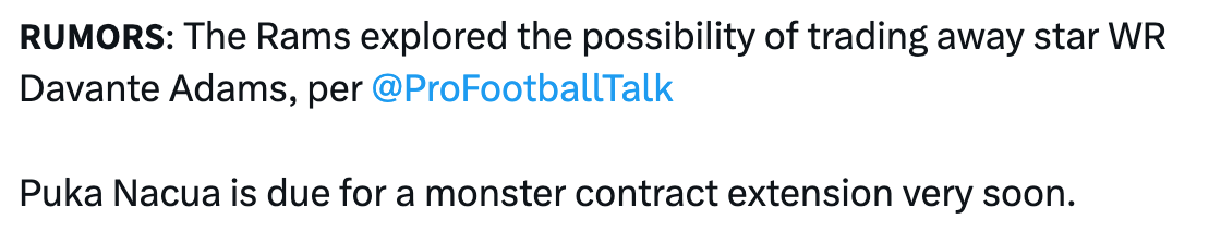 Puka is more important to the Rams than JSN is to the Seahawks and JSN is really important. I’m only saying that to emphasize how badly Stafford and McVay need Puka, which should concern some people because Puka is such a wild card.