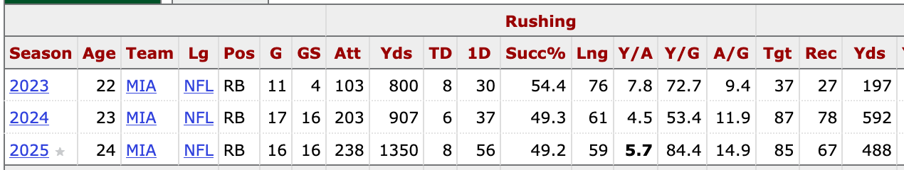 Achane is a year younger than Walker and his 2025 season was better than any individual season by Walker. To be fair, Walker’s last six games were better than anything Walker had done before that and those were all high-stakes games/the Super Bowl.