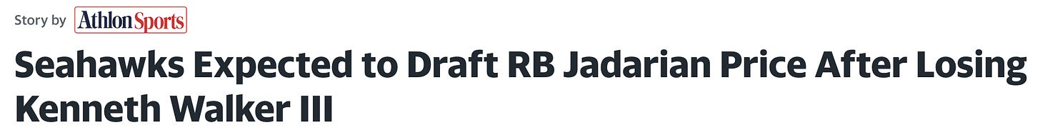 If he really wants running back Jadarian Price (for example) and he’s there at 25 and Schneider’s intel is that he isn’t going to get to 32, maybe then he starts tallying picks, calculating the cost, and then perhaps that’s when I’m proven wrong and he’s able to shift some of next year’s capital to this year.
