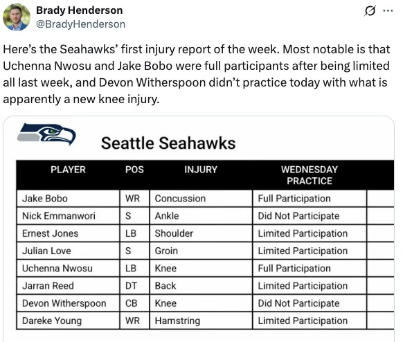 The Seahawks shared some good injury news on Wednesday’s first practice report of the week, as both Uchenna Nwosu and Jake Bobo were full participants. Unfortunately, does a ‘spoon full of sugar help the medicine go down?