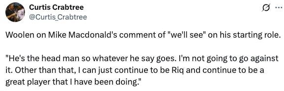 Witherspoon has played in 20 consecutive games without a miss and the Seahawks are even more reliant on his availability now as Mike Macdonald was noncommittal on Wednesday when asked about Tariq Woolen’s job security as a starting cornerback, simply saying, “We’ll see.”
