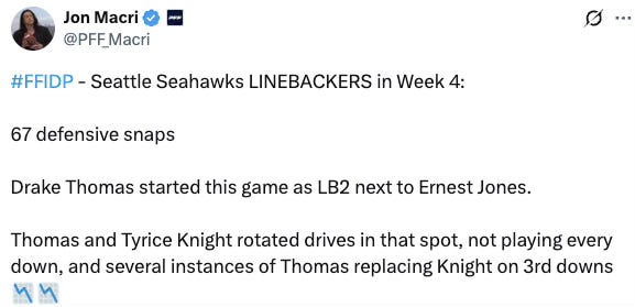Grant: Drake Thomas and Tyrice Knight seem to be splitting snaps a lot more than I anticipated. Is this just a situational football arrangement because Thomas is better in coverage? I remember hearing MM praise him as a really good dime LB. Has Thomas just carved out a role for himself beyond special teams, or is Knight struggling and loosing snaps for being a liability?