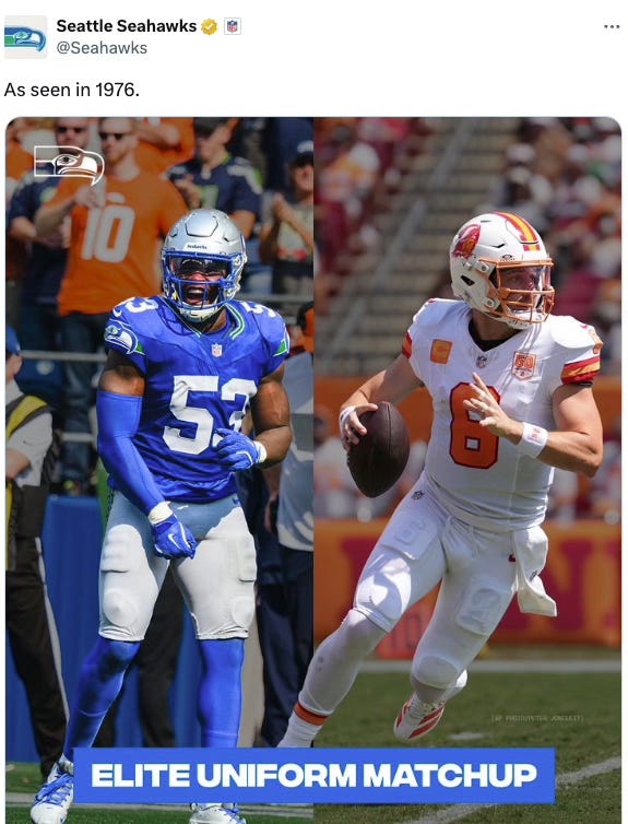 The Seahawks debated between Niehaus, running back Chuck Muncie (three-time Pro Bowler), and mostly spent their time on the clock trying to trade down (fifth overall pick CB Mike Haynes was the overall DROY and is in the Hall of Fame). Things turn out however they’re supposed to turn out, I just couldn’t help but think of Selmon again when the Seahawks tweeted that this is the uniform matchup in Week 5: