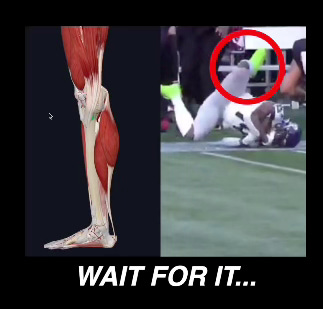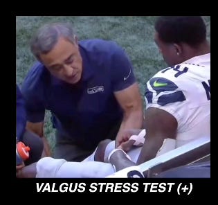 That Twitter account (where all these pictures are from) watched the broadcast footage, recognized the medical test being administered as the Valgus stress test, noted that Metcalf actually flinched during the test, and matched it up with the video to an MCL sprain or tear of some sort…within minutes!