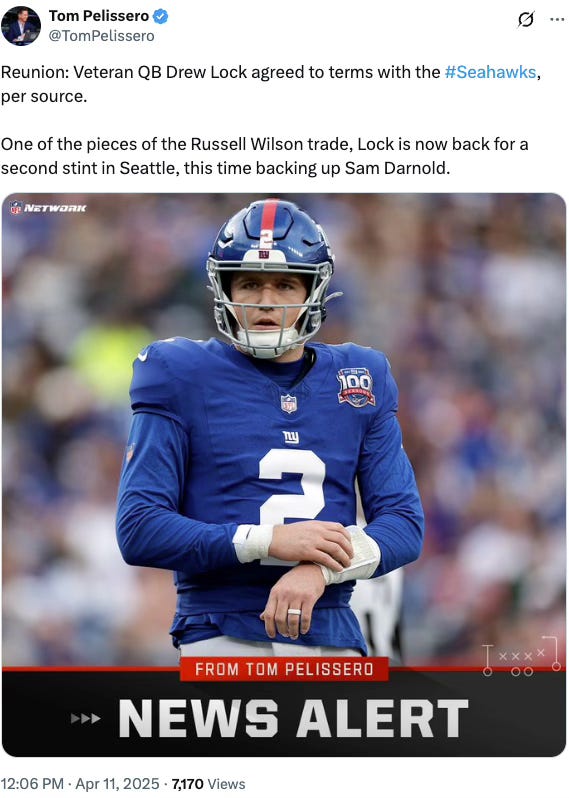 I’ve been noting Lock as a potental return a few times, including as a “bad quarterback” addition who could still help the team in some capacity.