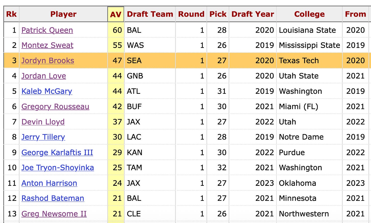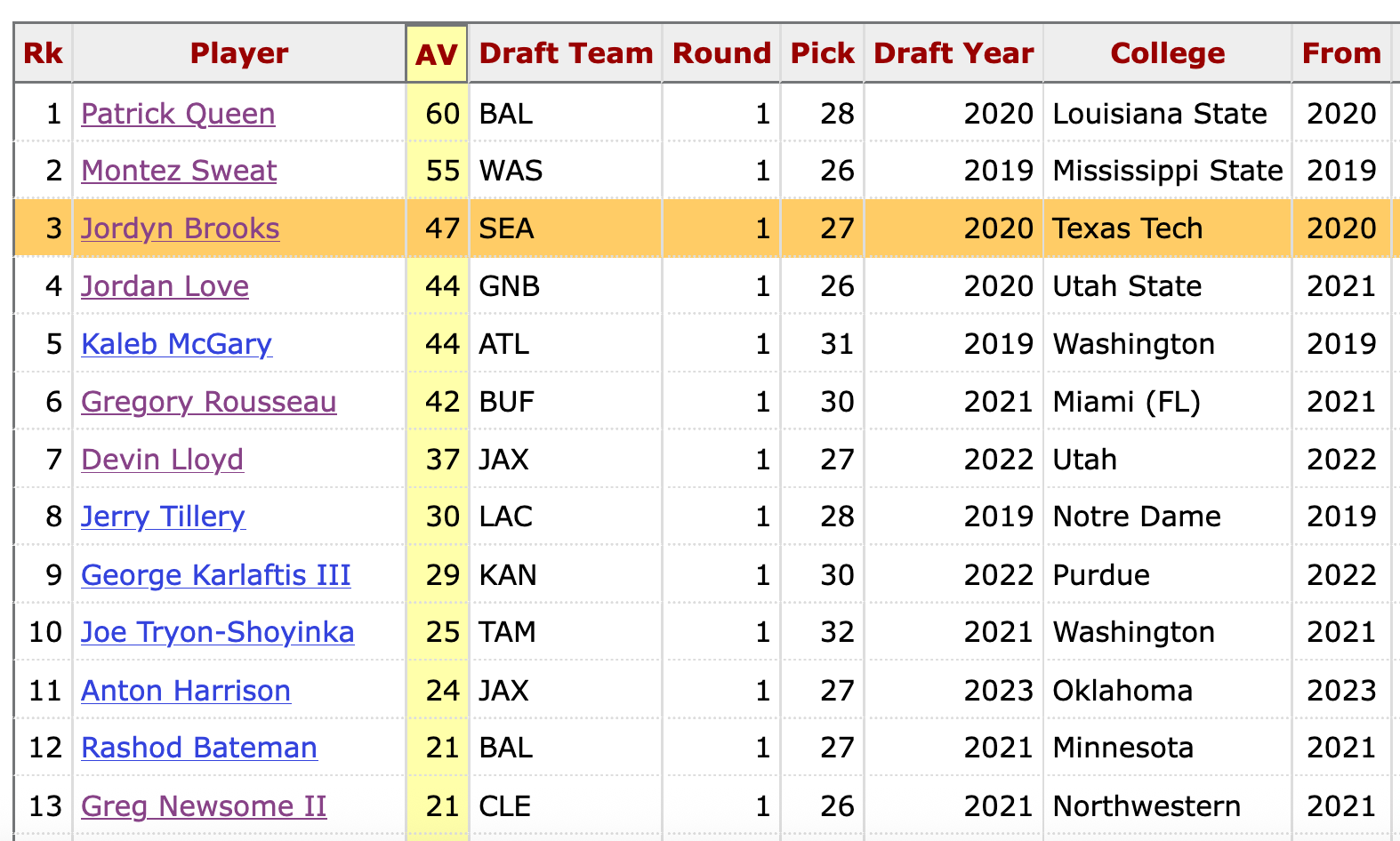 “AV” is a counting stat so it favors players who were drafted longer ago and I’m not saying this is an awesome criteria to use, but it gives us a baseline and I promise you that the list didn’t get that much better after Greg Newsome II (a player who only got a one-year contract in free agency).