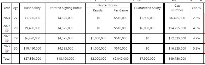 So hypothetically if the Seahawks sign Drew Dalman, the highest-rated center on the market, to a four-year, $50 million contract, his cost would be roughly $6.5 million in 2025 and $14.5 million in 2026. Here is the breakdown for Lloyd Cushenberry, a center who signed that deal in 2024:
