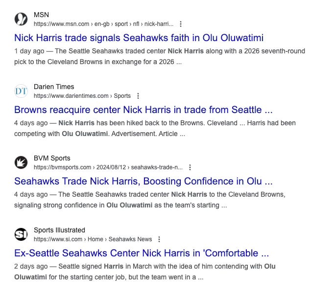 A) I don’t know where he got Harris from, as I think any Google search would have indicated that Oluwatimi was ahead of him for the entire offseason and b) Though Williams is a recent signing, Clay put the Vikings in 32nd place at quarterback because of J.J. McCarthy’s injury, which also happened this week, c) ESPN posted this article today, four days after Harris was traded to the Browns, but still let it get by all the editors to publish that Harris was Seattle’s projected starting center.