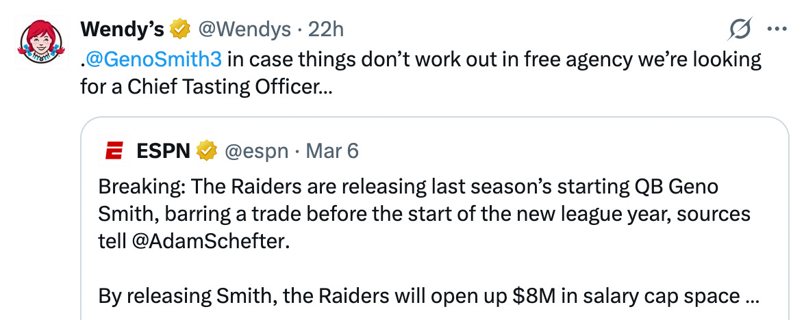 Not one person in the media was ready to be like, “Yeah, I think Geno’s going to get a little bit exposed by going from a perennial playoff contender to the Raiders, a team that lost six more games than Seattle did in 2024”?