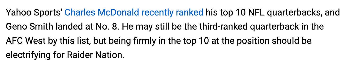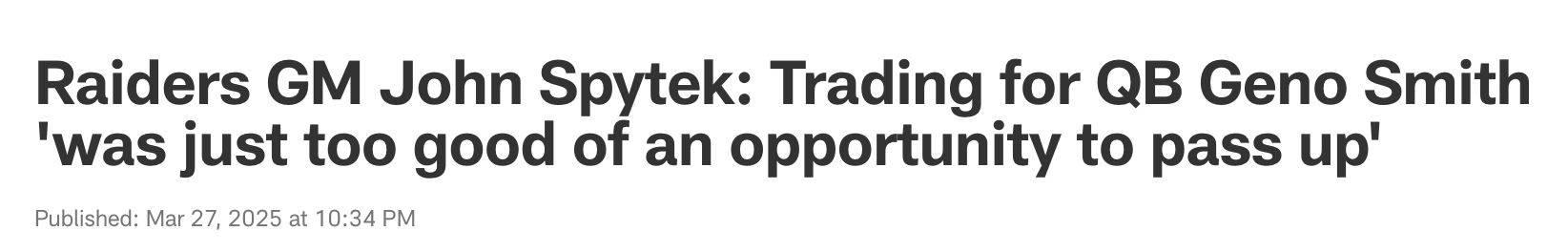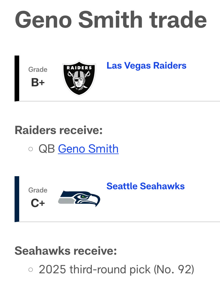Shouldn’t the “hot take” have been that: “Spending a third round pick and $60 million for a quarterback with an 0-1 career playoff record and a turnover problem will get the Raiders over the hump”? But it wasn’t and this is the degree to which it wasn’t: ESPN’s Benjamin Solak giving Seattle “the universally panned move” award for trading Geno.