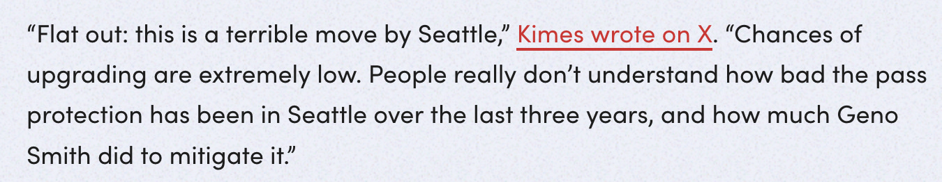 Seattle should be BETTER — not worse — with the offseason they’ve had so far: Released 5 players, including Tyler Lockett; Hired Kubiak to replace Ryan Grubb; Traded Geno for a 3rd round pick; DK Metcalf on the trade block; Tendered Brady Russell and Josh Jobe