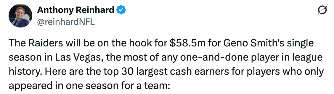 On Friday, the Raiders did set a record with Geno: Most money ever spent on a player for only one season with a team.