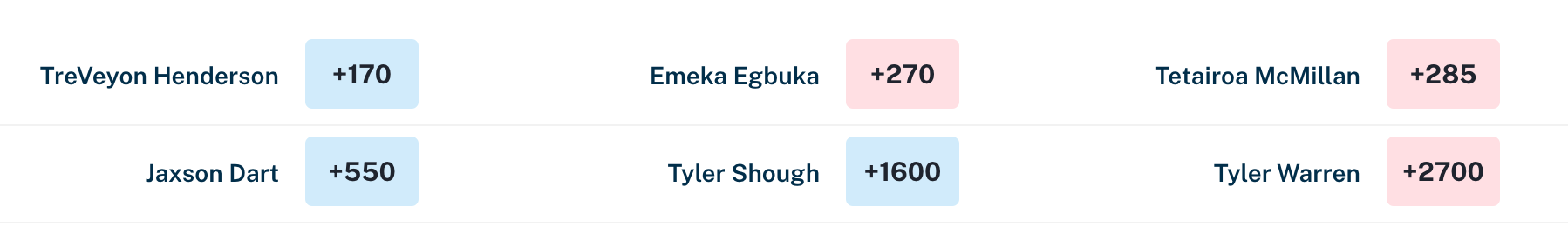 The easy bet to win the award at draft time, Jeanty is one the worst rushing team in the NFL. He has 700 yards and 3.5 YPC. I would bet Jeanty is still the best player in this entire RB class, but will need to get a better system/team around him.