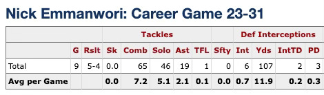 As a sophomore, Emmanwori ramped up his value as a defensive back by recording the first two interceptions of his career and increasing his passes defensed from 1 to 8. Strangely enough, Emmanwori’s six career interceptions (2 as a sophomore, 4 as a junior) came over this nine-game span.