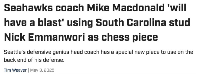 Nobody knows yet if Emmanwori’s versatility is because he can fit anywhere or because he’s a misfit everywhere, but if the Seahawks are proven right in their decision to trade up for him then it will be Macdonald’s ultimate checkmate.