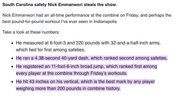 Emmanwori’s 10/10 Relative Athleticism Score is matched by few players in history, with one of those rare players being DK Metcalf. Emmanwori is the only safety in combine history to run a sub-4.4, a vertical over 43”, and a broad jump over 11 feet. That’s all aside from the fact that he’s 6’3, 220.