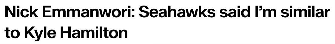 It amazes me the narrative on Emmanwori as a raw athletic freak. When a combine results are so good, people need to find faults elsewhere, see Shemar Stewart. You can't be a perfect prospect. But Emmanwori has had an amazing college career, how many true Freshman start in the SEC, start for all 3 years and is All American? His college stats were better than Buddha Baker, who we all think was great college player during his time at Montlake. Most college players have flaws and need to work to improve. Watching Malaki Starks this year, thought he regressed and gave up a lot of big plays, not the athlete that Emmanwori is, and played on a much better team, yet he got drafted in the first by Baltimore. It will be interesting to track their careers to see if the Raven's front office, who can do no wrong, made a mistake on passing on this kid. When JS trades up, he's been right most of the time.
