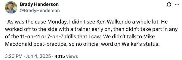 As soon as I allow myself to get hopeful for Walker to have a breakout season, my heart skipped a beat when I read this tweet from Brady Henderson that he “didn’t see Walker do a whole lot”.