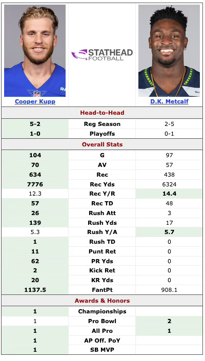 Hopefully everyone agrees that regardless of the two players being almost as unalike as any two receivers could be in terms of size, speed, style, demeanor, and everything else, that Cooper Kupp has had the better career than DK Metcalf. That should just be a fact and if that was hard to admit six months ago, it should be easier with Kupp back in Washington again.