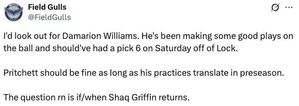 Since firing Pete Carroll, the Seahawks have only drafted two cornerbacks (Nehemiah Pritchett, D.J. James on day three in 2024), didn’t pick a single one this year*, and they were fine waiting all the way until July before signing Shaquill Griffin, who has so far missed almost all of training camp…and I haven’t heard anyone panicking about it.