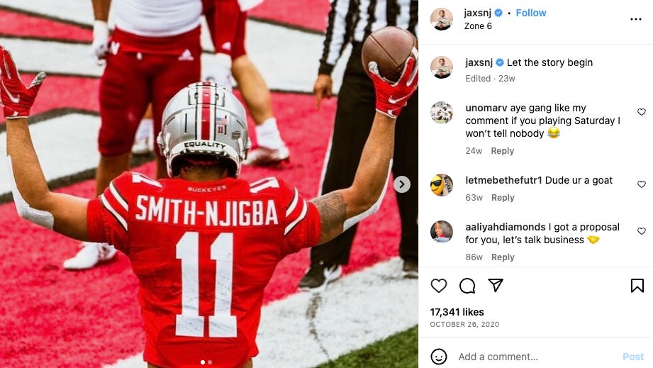 On October 26, 2020, Jaxon Smith-Njigba posted “Let the story begin” on Instagram, two days after making his first career catch and scoring his first career touchdown as a college receiver for the Ohio State Buckeyes.