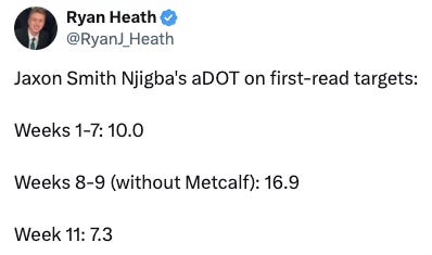 In the four games prior to DK Metcalf’s knee injury, JSN was averaging a concerning 4.2 yards per target, as 34 targets produced just 144 yards. But after Ryan Grubb and Geno Smith were left with no other choice other than to build a game plan for JSN, the quality of those targets went up and JSN delivered at clutch moments.