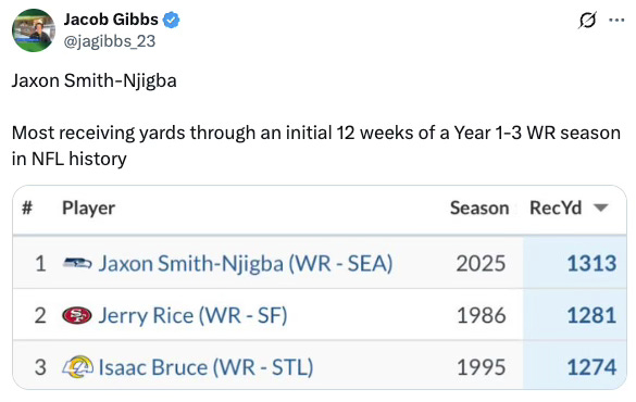 JSN curently has 21 catches of 20+ yards, which have gained 730 yards and scored 3 times. The next-most is George Pickens at 17 catches for 519 yards. Emeka Egbuka is the only other player over 13 catches and 400 yards.