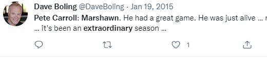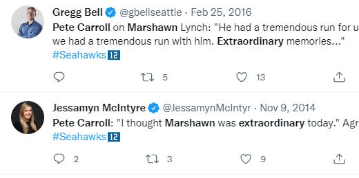 When else has Pete used the word extraordinary? He’s used it in instances for Russell Wilson, for Doug Baldwin, for Paul Allen, for Jamal Adams, for Percy Harvin, for Richard Sherman, for Bill Belichick, for his mentor Jerry Burns, for the 12th man, for Marshawn Lynch, and again for Marshawn Lynch, and again for Marshawn Lynch.