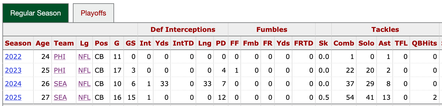 If Jobe’s market comes in around $16 million per season (that’s the D.J. Reed range) then keeping him allows a smoother transition for Mike Macdonald’s defense in 2026 than needing to coach up an entire new group of outside corners.