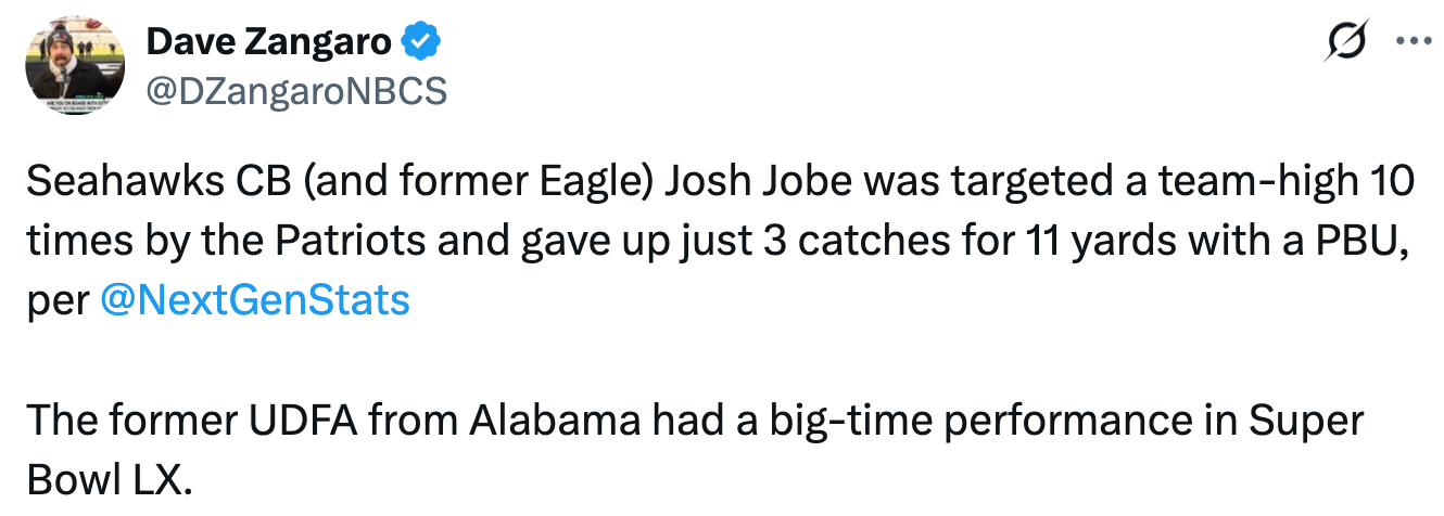 Jobe had arguably the hardest job of anybody in the secondary because quarterbacks must avoid Woolen and Devon Witherspoon — essentially making him the “Brandon Browner” or “Byron Maxwell” of the group — and he did more than just acquit himself … I’d say he was more valuable on a per play basis than Woolen.
