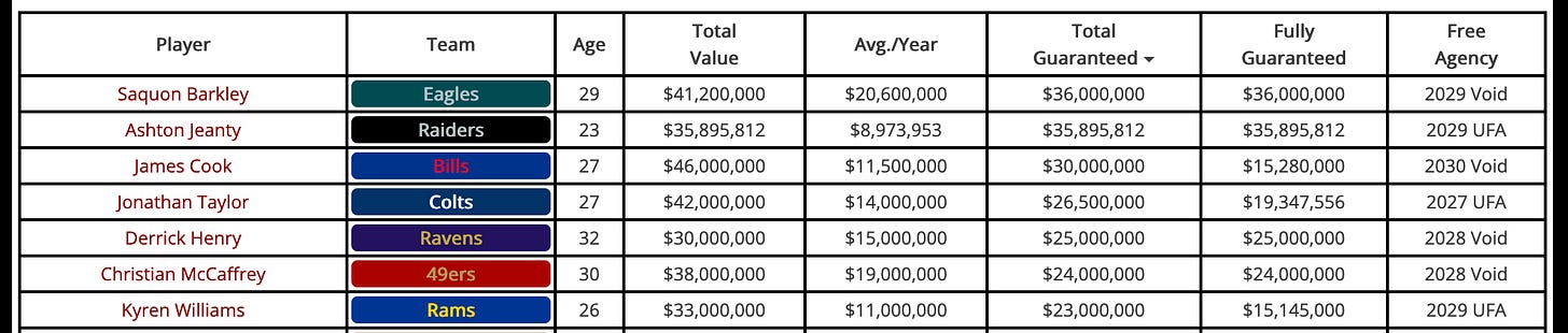 There’s a clear logic to placing the franchise tag on a running back because if you love the player but you fear the threat of a devastating injury then you’re paying for exactly one more year of service. In 2023, Saquon Barkley, Josh Jacobs, and Tony Pollard all received the franchise tag, presumably proving that this is the way for teams to go. Except for one flaw.