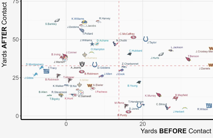 An interesting comparison comes from the opposing team, as 49ers backup Brian Robinson, Jr. was next on the list with 3.7 yards before contact against Seattle’s defense, whereas Christian McCaffrey wasn’t far behind at 3.1. For whatever reason, San Francisco’s offense gave the two backs rather equal footing.