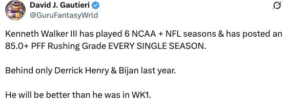 Over at NextGenStats, Walker’s -21 Rushing Yards Over Expectation is the third-worst of Week 1 (McCaffrey’s -25 is the worst) and Charbonnet is still below average at -2.