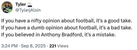 Was this a bad start for Kubiak’s offense? It was a bad start for Kubiak’s offense. But there were some positives there, like encouraging play from Darnold, a dominant showing from Jaxon Smith-Njigba minus a few negative moments, and reason for optimism as a pass protecting unit. Maybe Bradford doesn’t start 17 games and maybe there’s a time when Cooper Kupp shows up or loses to snaps to someone who will, like Tory Horton, Jake Bobo, or Dareke Young.